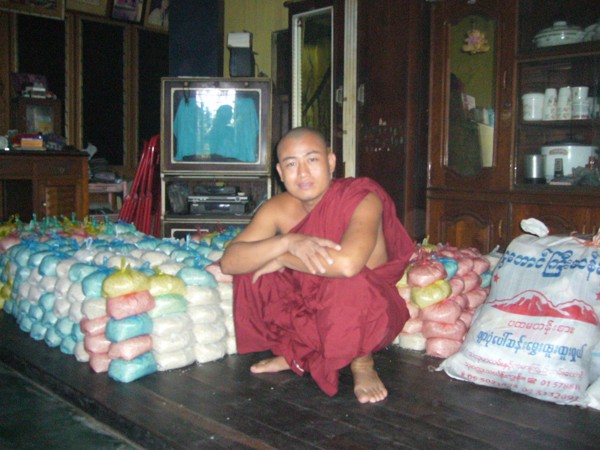 Rice and other relief supplies from Young Buddhist Student Literacy Mission awaiting distribution at Dhammicarama Monastery.