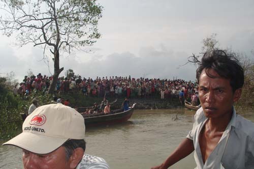 Refugees waiting for relief supplies at the dock of the boat that plies between Kwan Chan Gon and Lat Khuk Gon.