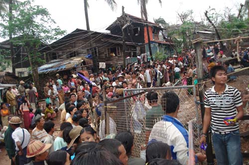 Refugees in Bogalay gathering to receive relief supplies.