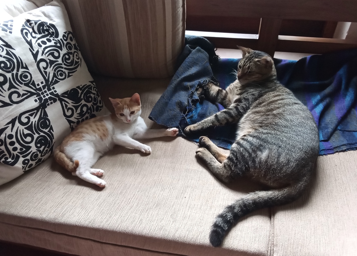One day, while Ken was inside a pharmacy on busy Peradeniya Road, Visakha and Ashoka noticed that a tiny kitten was on the verge of falling into the sewer. Men standing nearby explained that the kitten had been abandoned there that morning. Ashoka quickly found an empty box and rescued it. Not sure why, but, even before we got home, we were calling the little darling Michel(le). The courtyard was rearranged as her (as we confirmed) living quarters. (She is too small to face the great outdoors with its marauding cats and dogs, and too rambunctious to be allowed unattended in the living/dining/altar room.) We gave her a sandbox, and she showed her appreciation by sleeping in it. The next morning, there was that familiar malodor, but we could not locate it. A coulple of days later, we discovered Michelle's feces in a pot of anthuriums. She had trained herself. Let's hear it for instinct! We replaced that anthurium pot with a clay pot of sand, and she graciously accepted the change. Now the courtyard, where she dines and spends her nights, is filled with toys, and she is very happy. Leo did not at first accept the intrusion, but they have beome friends and sometimes play together, but, once in a while, he becomes impatient with her teasing.