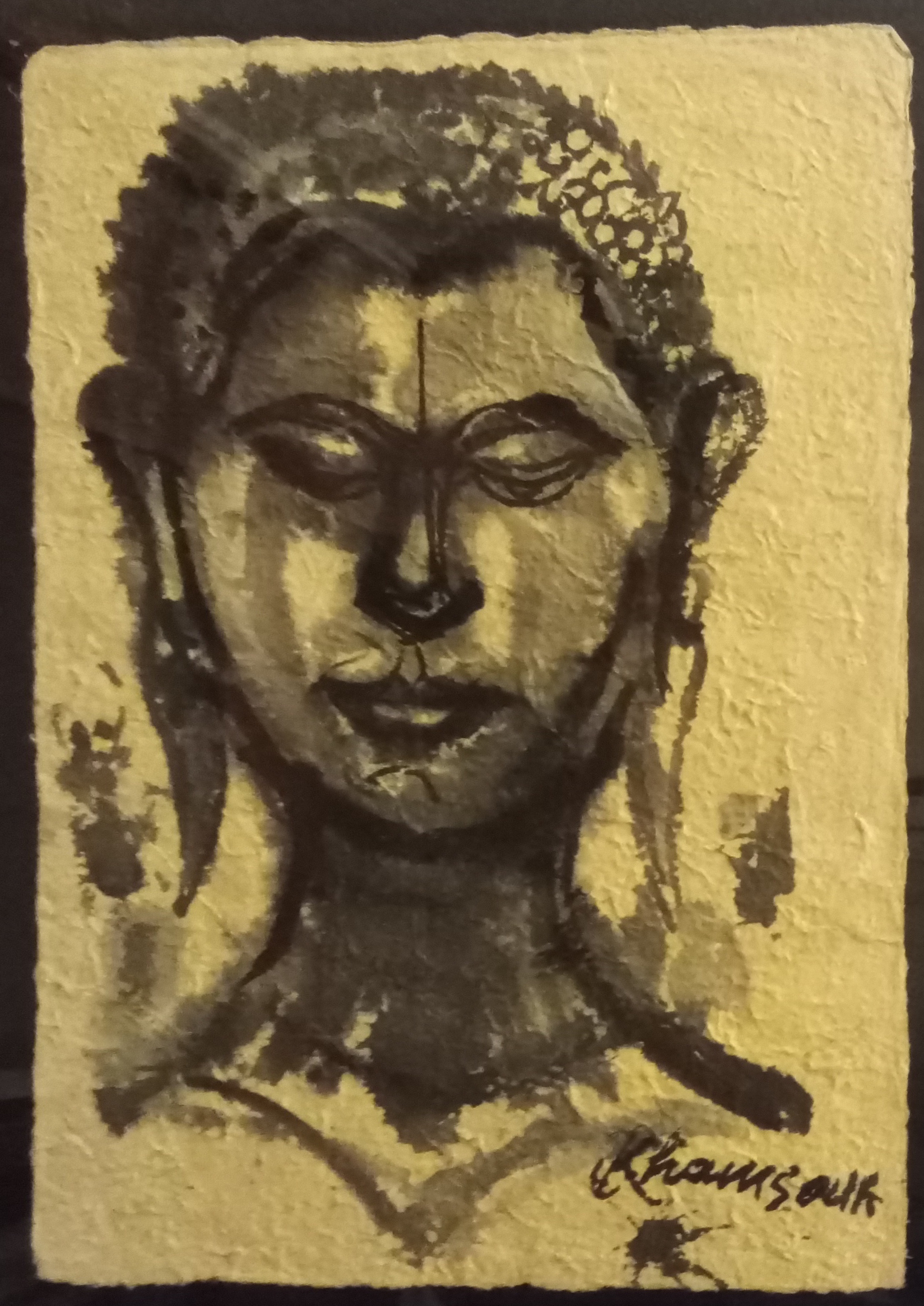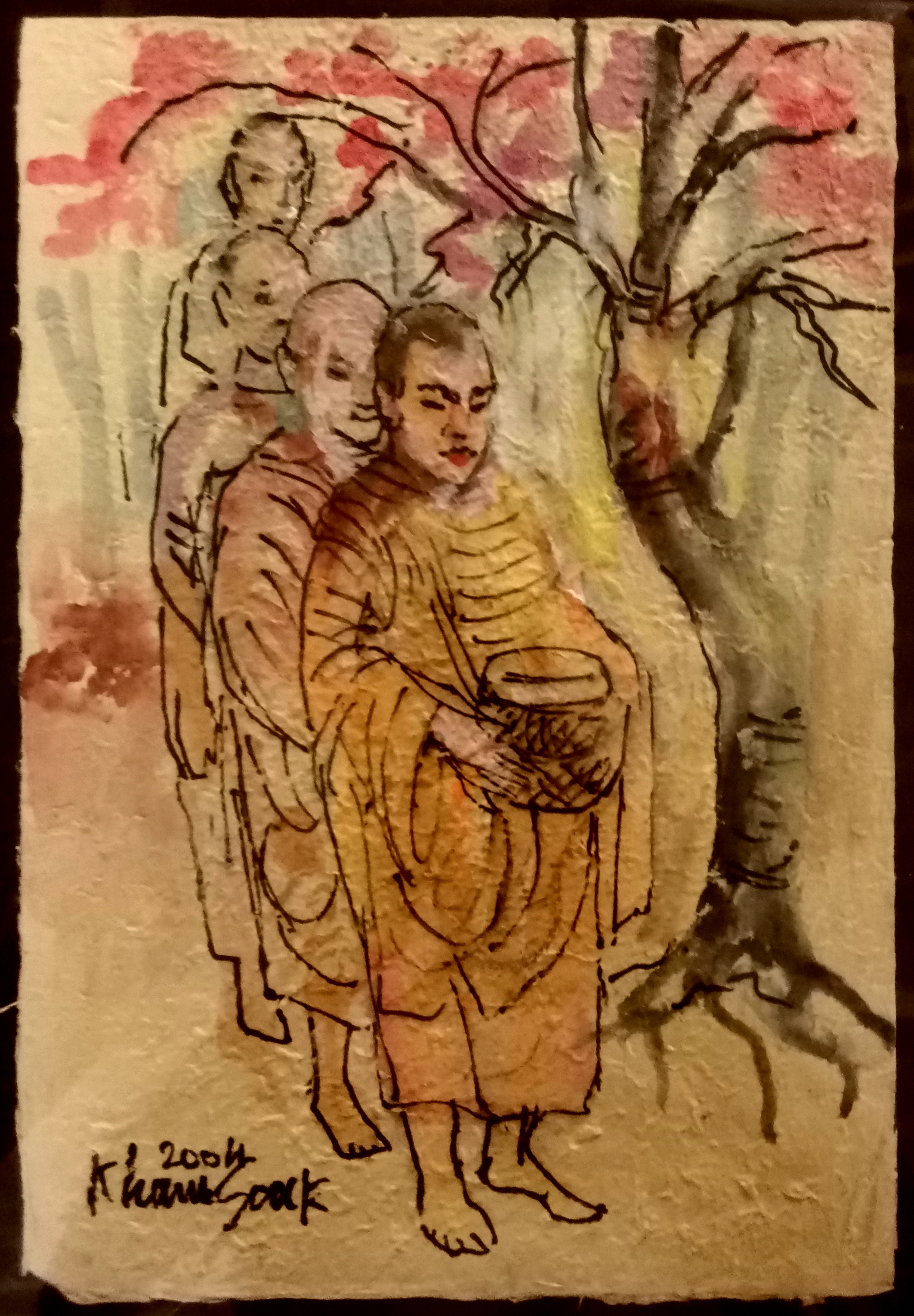 In 2005, we knew that our thirty-day Thai visa was going to expire, so we had scheduled a quick trip into Laos. It was our first time to cross the Mekong, and it was a lot of fun. We did not venture outside of Vientiane, but we thoroughly relished the relaxed atmosphere of the city compared to the frenetic pace in Bangkok. Near Pha That Luong, the most important stupa in Laos, we noticed an artist's studio and stopped to admire his work. The walls were covered with hundreds of beautiful framed paintings. The artist explained some of them and introduced us to his wife and daughter. We were so impressed that we bought two water-colors painted on hand-made paper, much cheaper, of course, and easier to transport than the huge canvases. We have appreciated these two paintings, but we never thought much more about the artist. A few weeks ago, we decided to do a Google search, using the signature as a guide. To our surprise, we discovered that that artist, Khamsouk Keomingmuang, has been designated the National Artist of Laos, and his work is displayed in several museums, including the Singapore Art Museum.