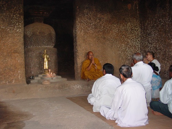 The next morning, we drove through the town to a nearby hill. After going up a narrow road, we left the car and climbed up, up, up to two simple caves with good drip ledges and monks' beds carved from the rock wall. These would have been the night quarters. Making our way around the hill (Visakha could only do such things with Ken's considerable help, of course.), we found a large cave which would have served as a worship hall. Around the sides of this hall was a ledge on which monks could have sat. There were several small chambers for meditation at the sides. At the back of the cave (the front of the hall) was another sizable chamber containing a beautiful stupa carved from the rock. This configuration dated the cave to the reign of King Ashoka in the third century B.C.E. Until recently, this cave had been used by a Muslim trader who had kept his donkeys inside, but it had been reclaimed by local Buddhists. A small image of the Buddha and an incense burner had been placed in front of the stupa, and ceremonies were regularly held there. Our guides spread mats so that we could all kneel in the hall while Bhante led us in worship. The sound of the chanting which filled the cave was wonderful. We heard that there were also a number of small Buddhist caves on the other side of the hill, but these were used by Hindus.