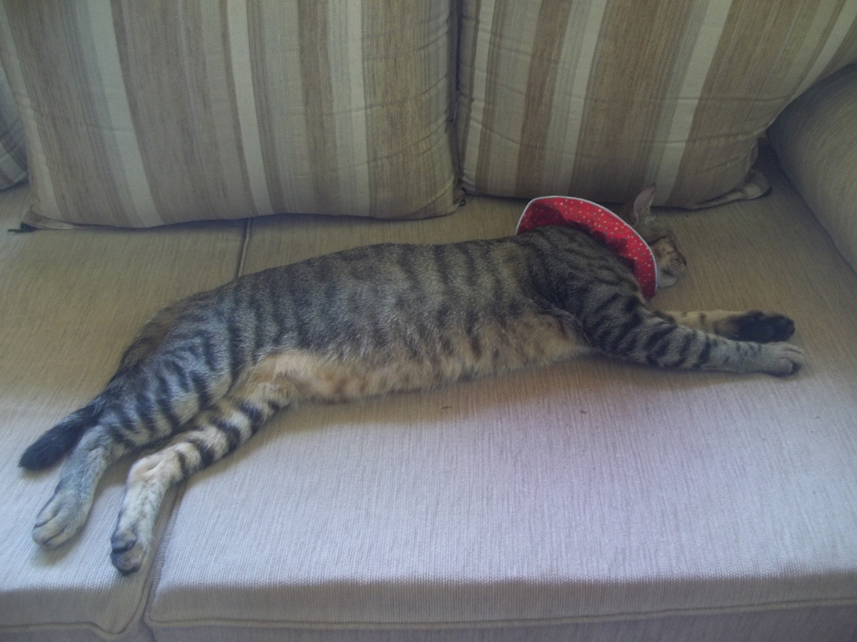 Leo, though we love him dearly, has not, by any means, replaced Nezumi in our hearts. Nevertheless, we have begun allowing him more frequent access to the inside of the house, but not too much, because he is, by nature, a bit clumsy. His favorite resting spot is the sofa in the living room.