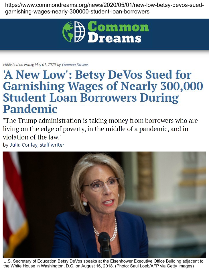 The U.S. Secretary of Education Betsy DeVos has invoked an unlawful and unconscionable policy of garnishing the wages of nearly 300,000 student loan borrowers during the pandemic.