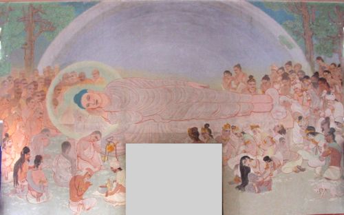 The walls of the vihara are adorned with beautiful paintings of the life of Buddha by a Japanese artist. This shows Buddha's Mahaparinibbana.