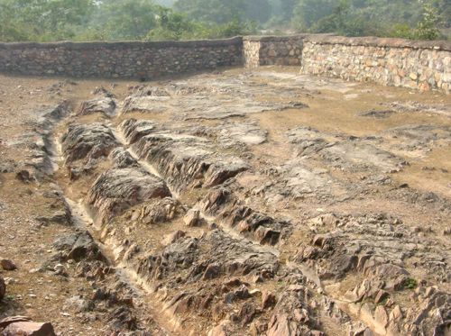 Near the mango grove there are wheel tracks which have been worn deep into the rock over the centuries by chariots and carts entering and leaving Rajagaha.